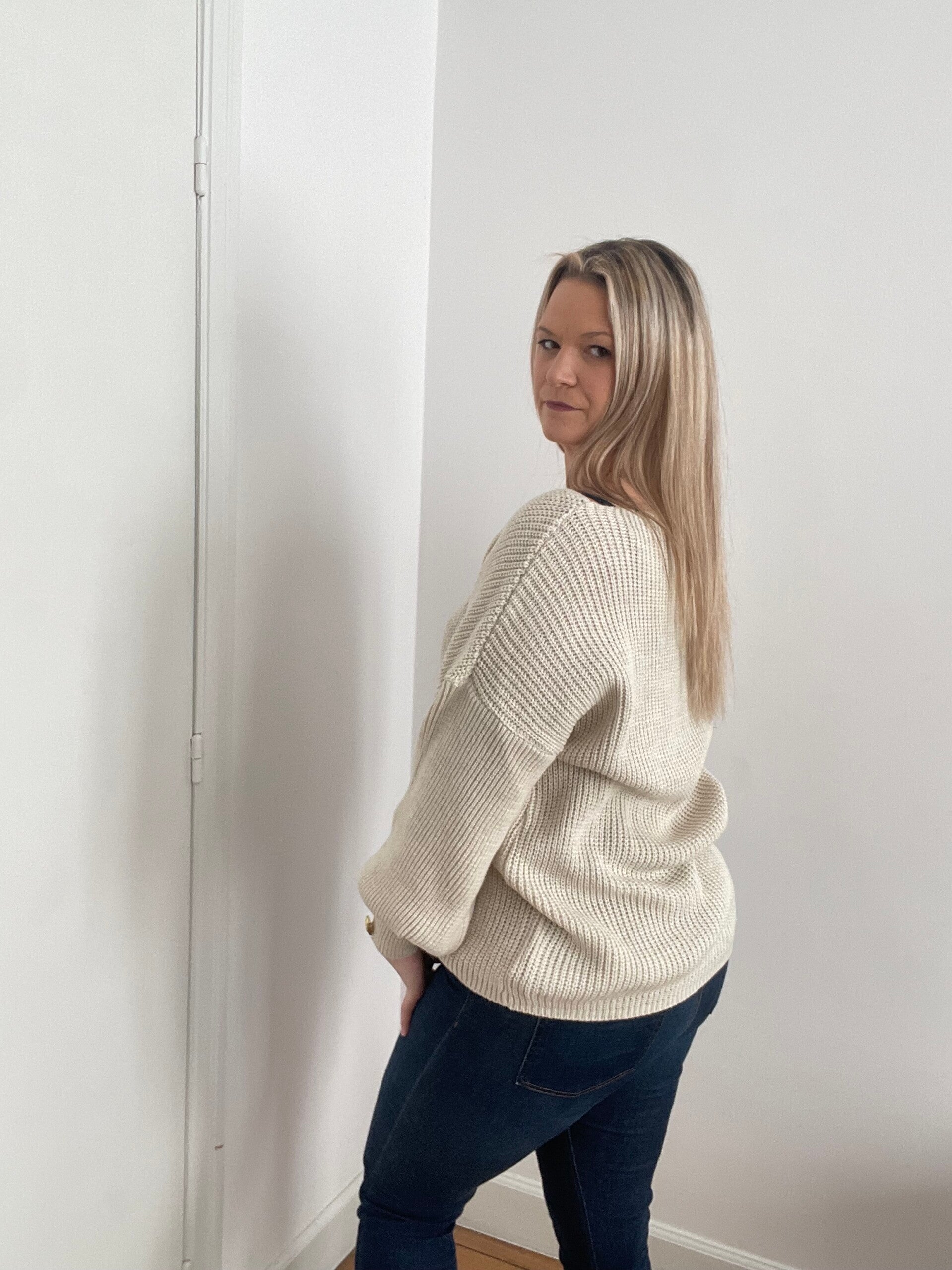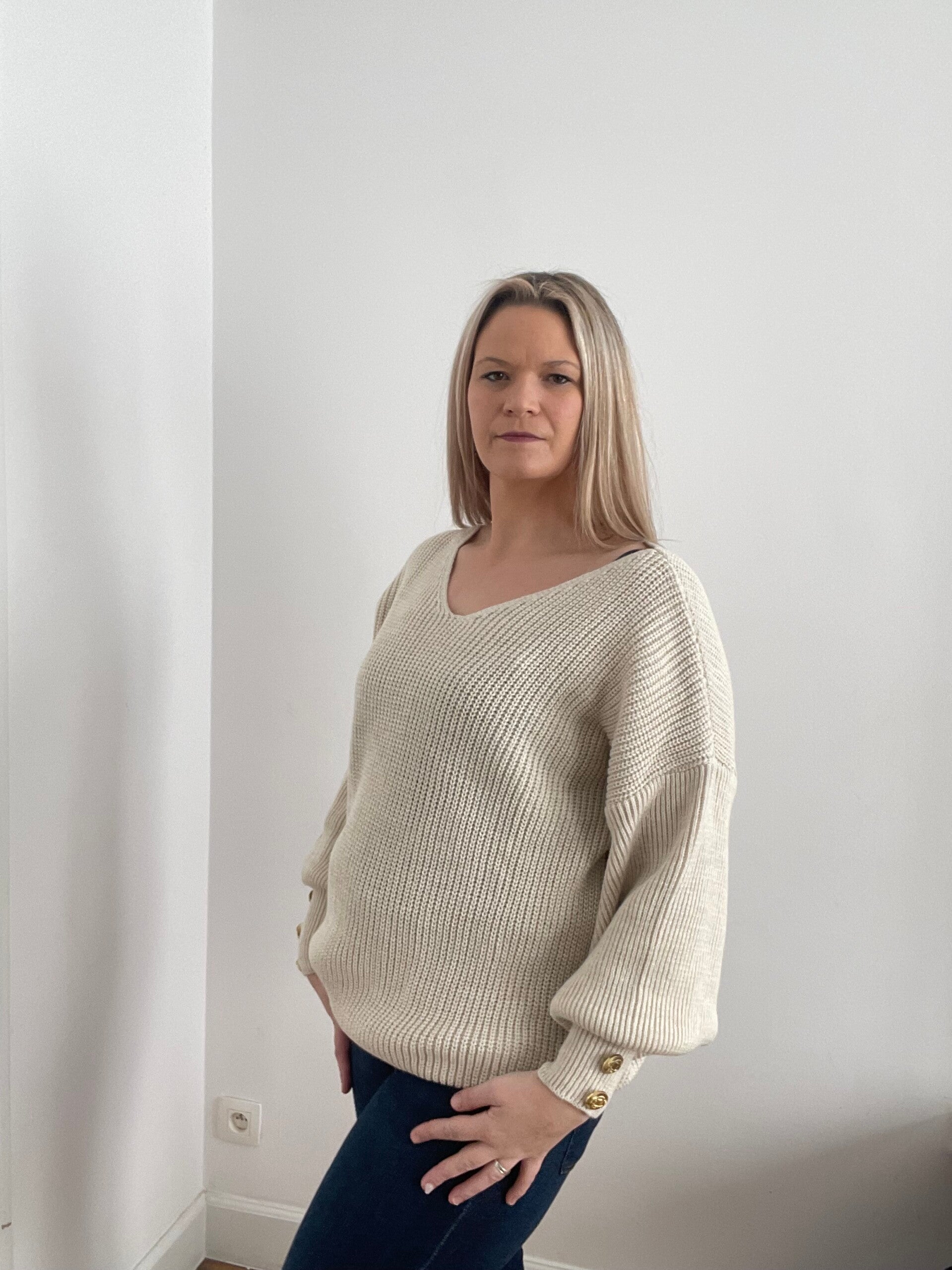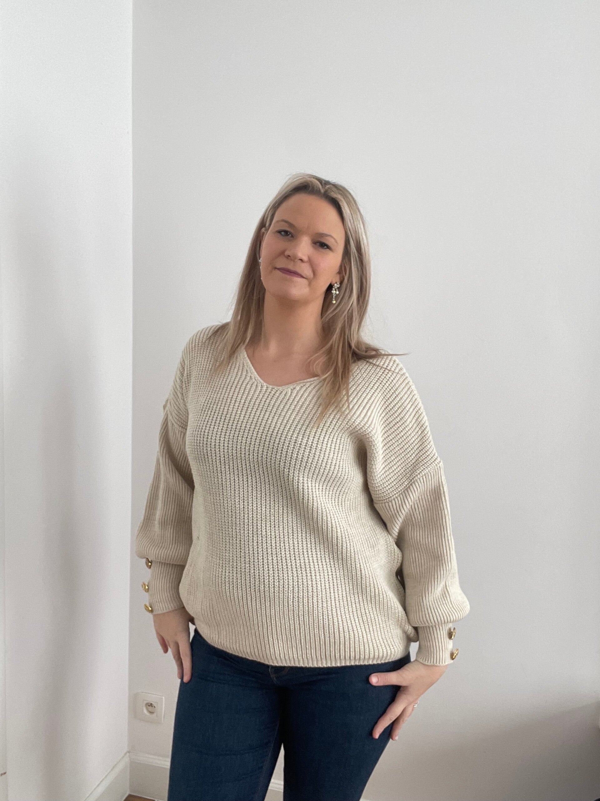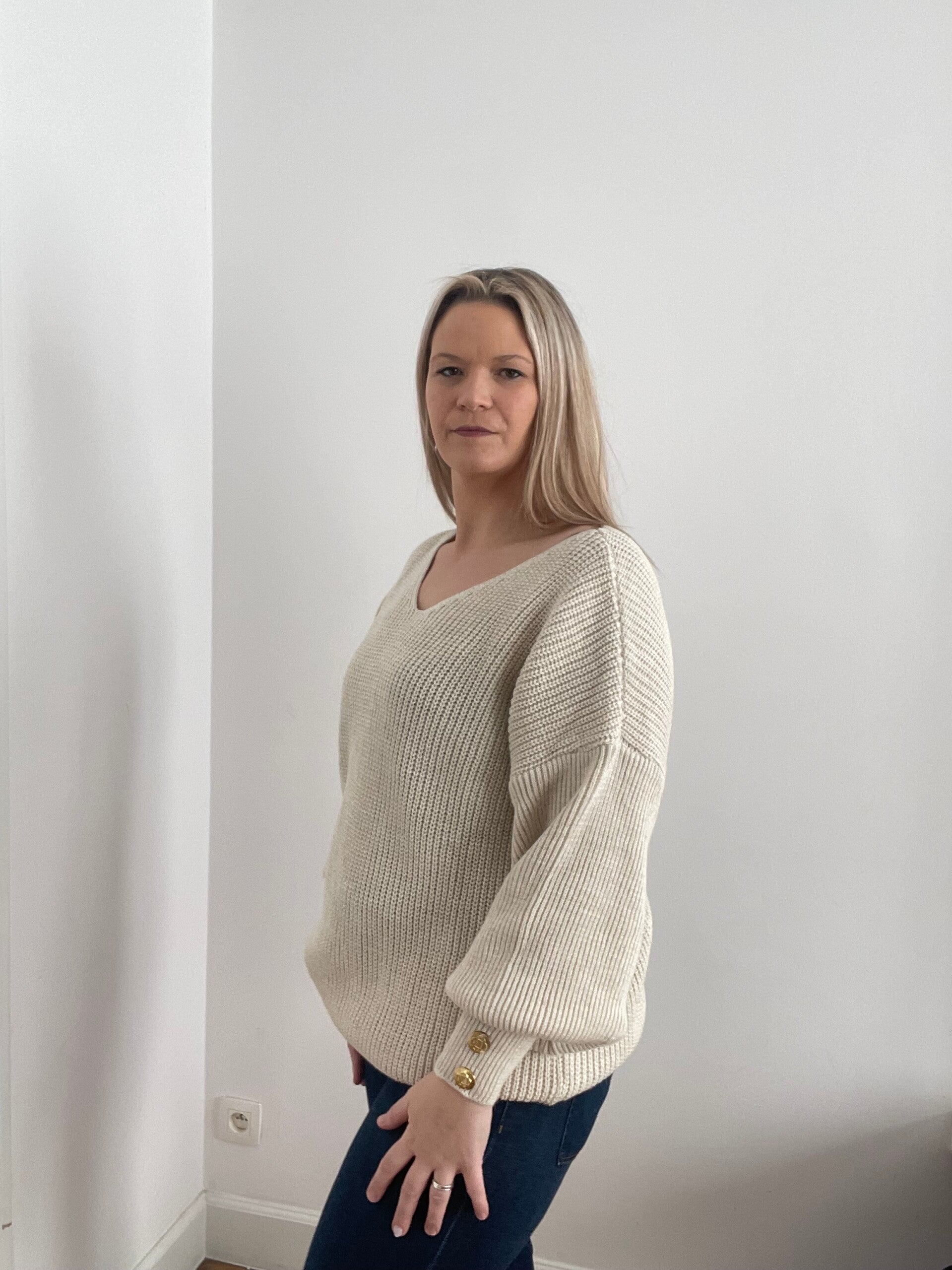 6012 Gebreide trui met v hals beige