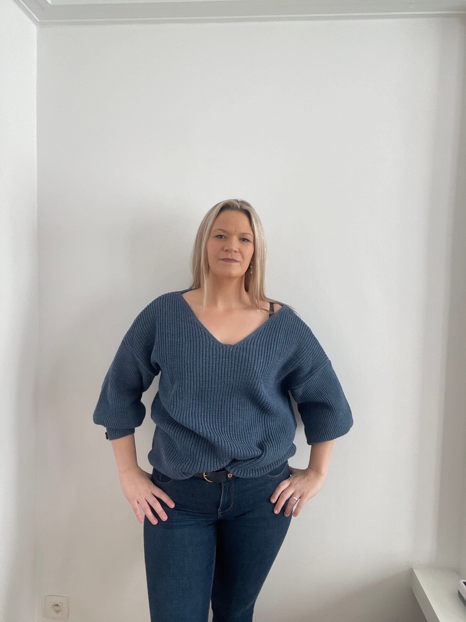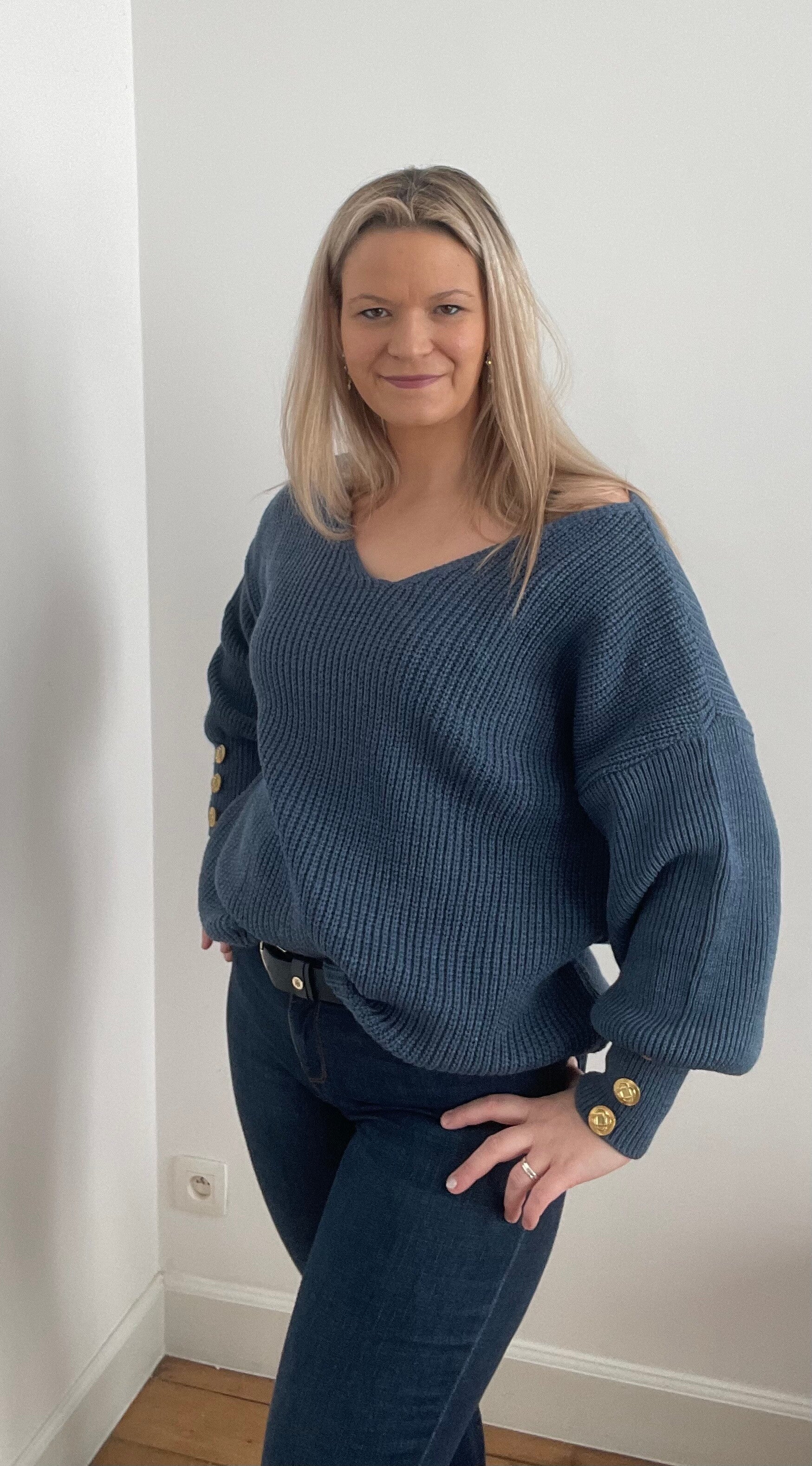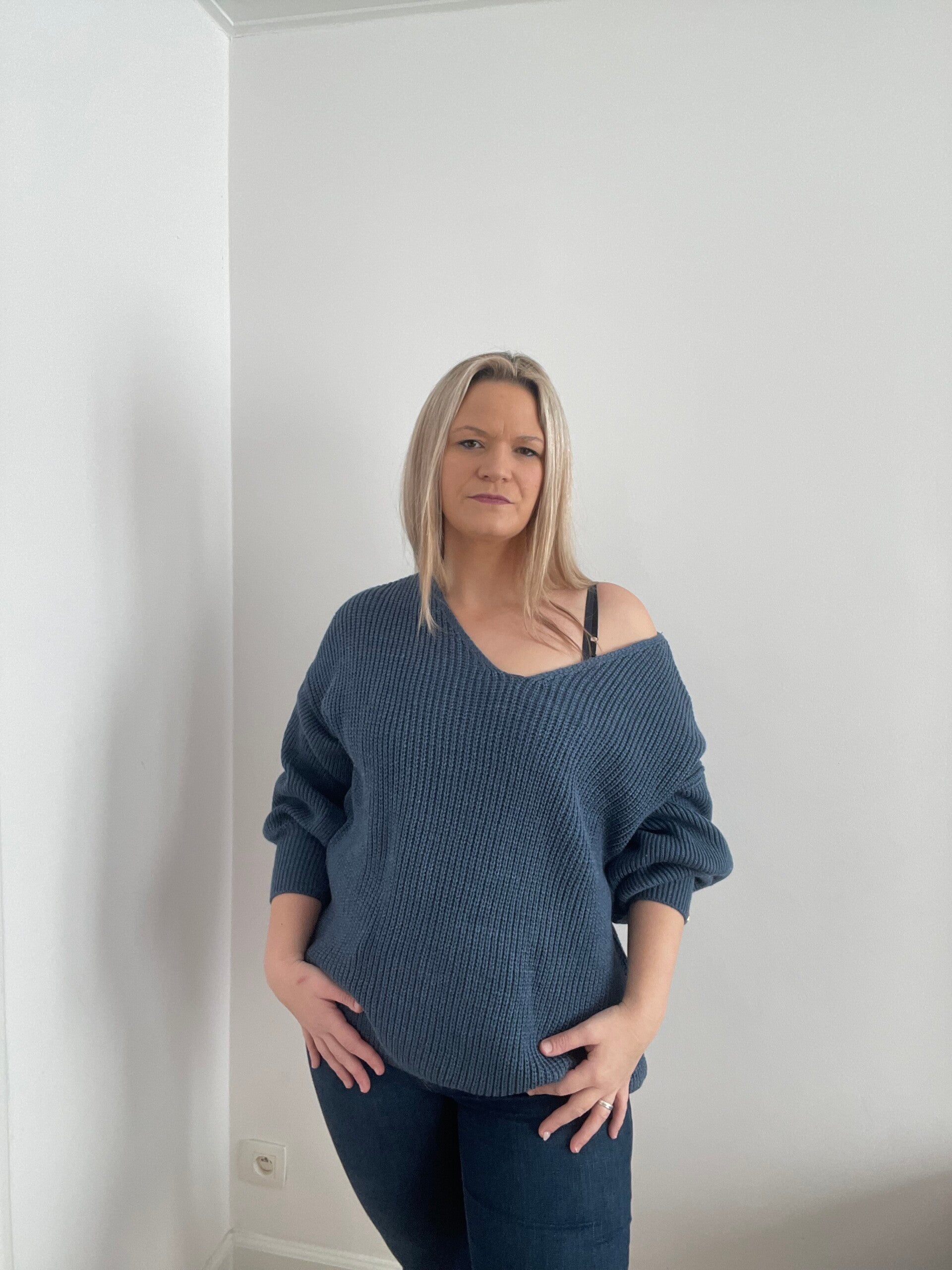 6037 gebreide trui met v hals donker blauw