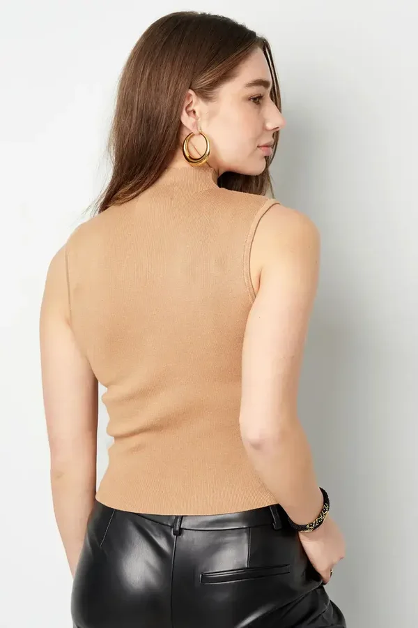 Deze mouwloze top met kol is een goeie basic om toe te voegen aan jouw garde-robe Vanwege de simpliciteit van de top is hij te combineren met een verscheidenheid aan jassen. Echt een aanrader! De top is gemaakt van viscose en verkrijgbaar in de kleuren zwart, bruin en beige.