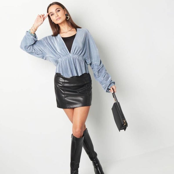 Trend alert!! Hoe leuk is deze bruine blouse met rib structuur en prachtige geplooide mouwen! Dankzij de prachtige mouwen, valt de blouse erg mooi en speels. De blouse is voorzien van een V-hals en heeft een elastieken band in de taille, waardoor de blouse mooi valt. Leuk om deze blouse te combineren met een blazer en jeans voor een casual look. Heb jij een feestje gepland? Draag dan deze blouse in combinatie met een pantalon of rok! Blouse met rib structuur en geplooide mouwen is gemaakt an 100% polyester en shop je in de maten S - M - L. Verkrijgbaar in de kleuren: blauw - bruin - grijs
